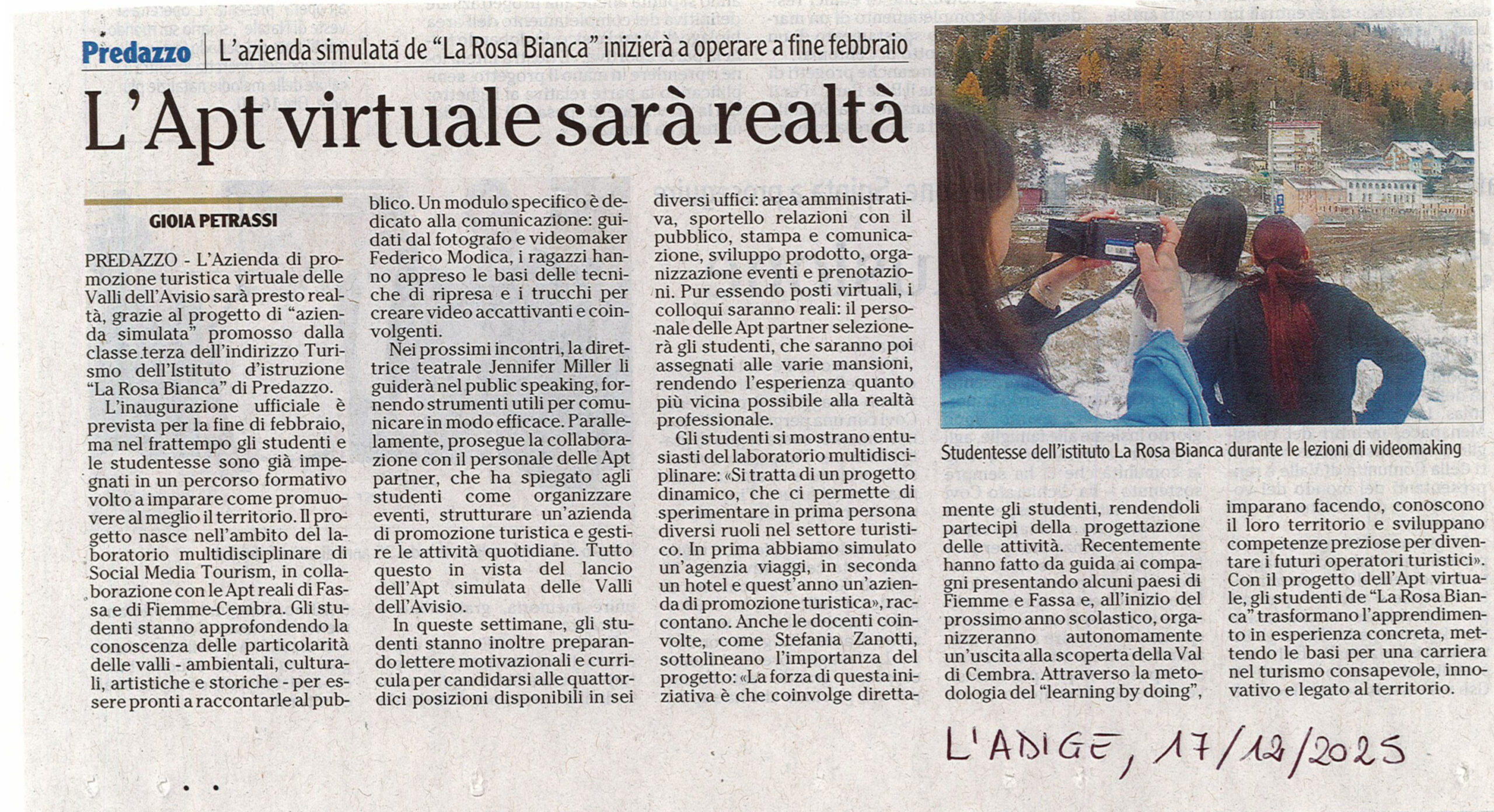 L’Adige del 17 dicembre dedica un articolo al nuovo progetto dell’Istituto La Rosa Bianca: l’azienda simulata di promozione turistica delle Valli dell’Avisio, che diventerà operativa a fine febbraio.