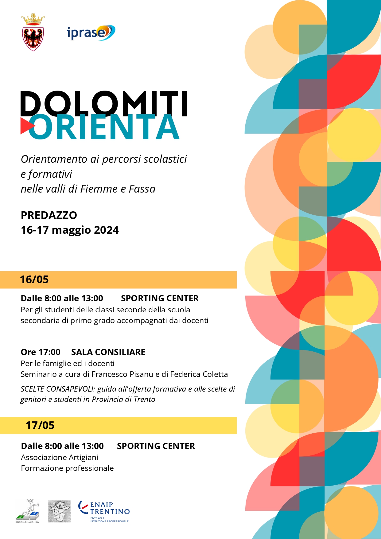 Mag17:00 - Presso la Sala Consiliare: seminario "SCELTE CONSAPEVOLI: guida all'offerta formativa e alle scelte di genitori e studenti in Provincia di Trento" a cura di Francesco Pisanu e di Federica Coletta destinato a famiglie e docenti.