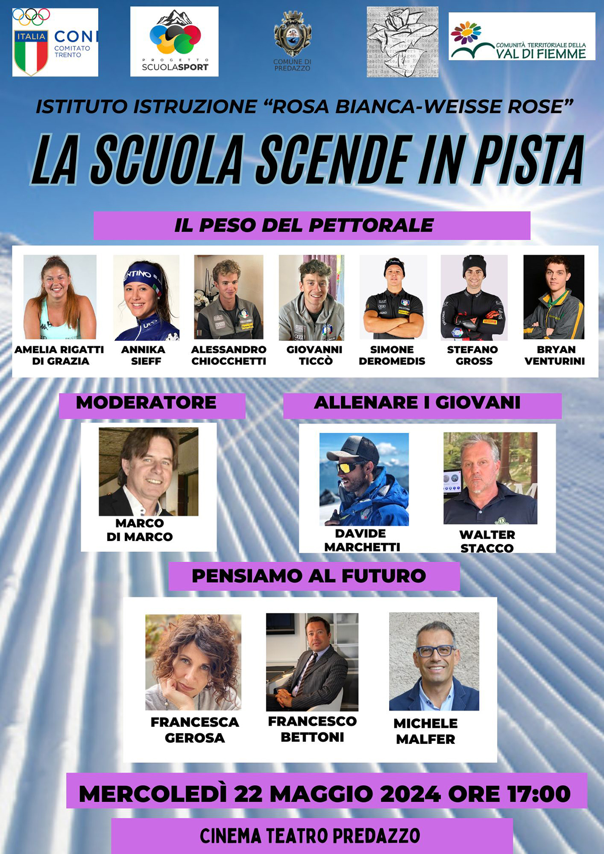 Nell’ambito del Progetto scuola-sport, L’Istituto di Istruzione “La Rosa Bianca – Weisse Rose” di Predazzo organizza il convegno “La scuola scende in pista: Il peso del pettorale” il 22 maggio 2024 al Cinema Teatro di Predazzo alle ore 17.00.