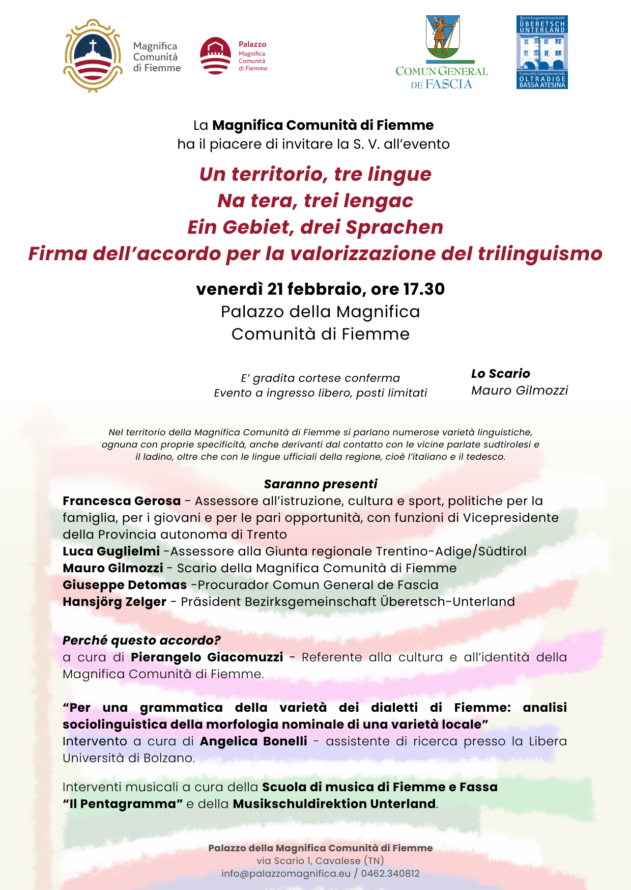 con le vicine parlate sudtirolesi e il ladino, oltre che con le lingue ufficiali della regione, cioè l’italiano e il tedesco.